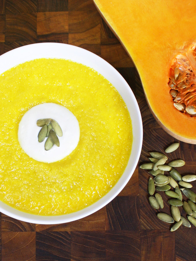2月中旬でまだまだ寒い日が続いていると思いますが、皆さん如何お過ごしでしょうか。今回はほっこり温まる、セージの効いたバターナッツかぼちゃのスープをご紹介します。ミキサーで撹拌するだけの簡単、時短ロースープ。たっぷり入ったバターナッツかぼちゃの他にも、人参、セロリ、リンゴが入っているため、食べ応えがあり、これだけでも充分お腹いっぱいになってしまいます。ローとは言え、48℃以下までならローでも温められるので、温かいスープも召し上がれますよ。 バターナッツかぼちゃは最近日本でも出回っていますが、アメリカでは秋冬の定番のかぼちゃ。パンプキンや日本のかぼちゃよりも柔らかい皮が剥き易く、火の通りも早いのが特徴。その使い易さやバターの様に滑らかな実が重宝され、定番料理のスープ以外にもロースト、ラビオリ、詰めて焼いたりなど様々な料理に使われます。栄養満点でカロチンやビタミンB、抗酸化物質、食物繊維が豊富。バターナッツかぼちゃを選ぶ時は、ズシッと大きさの割に重さのある、皮にデコボコや艶のないものを選びましょう。